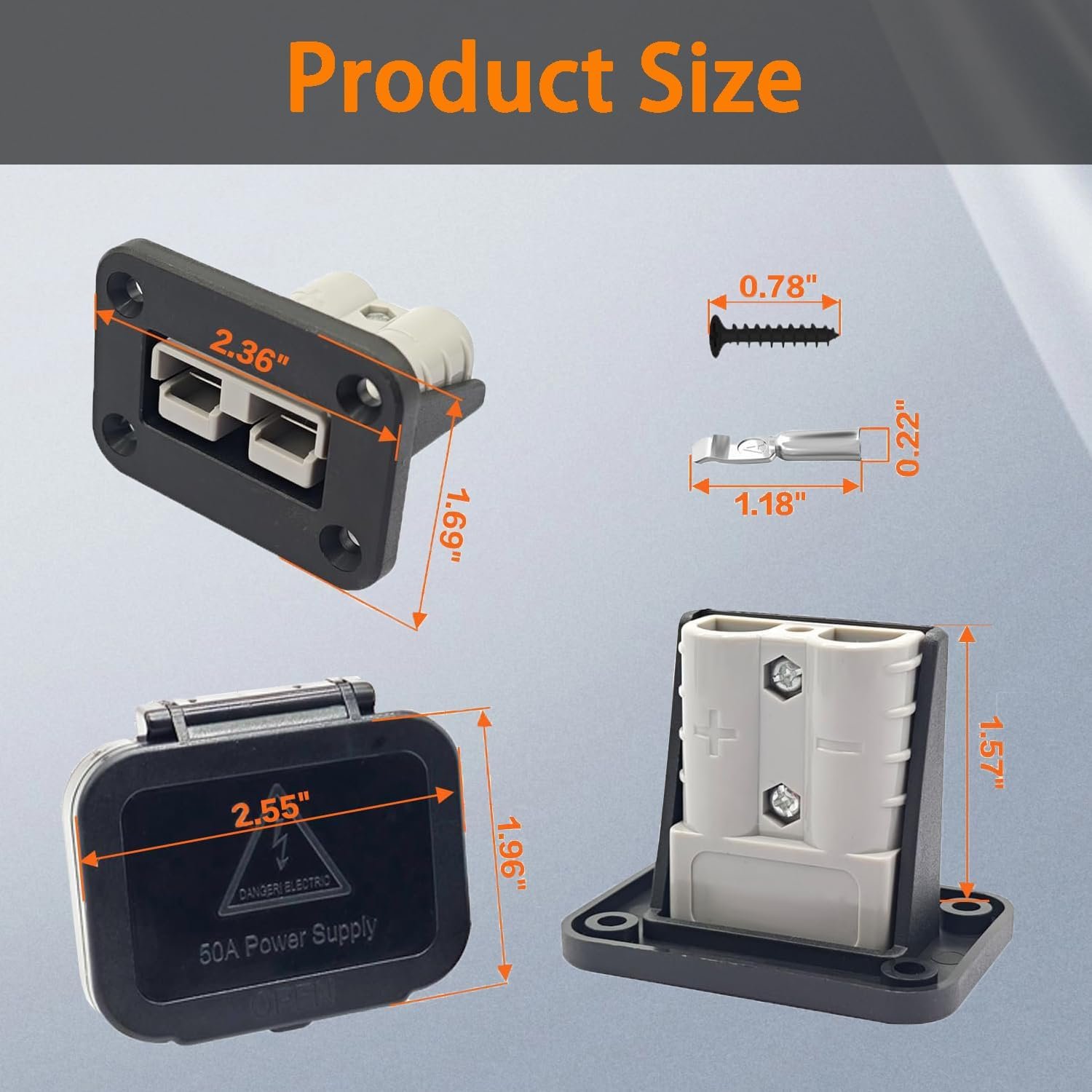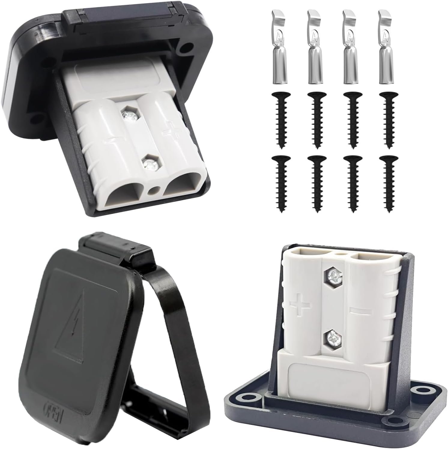 Versatile Application: This socket panel is specifically compatible with Anderson Power SB50 Series Connectors, ensuring a secure and reliable connection. Use for caravan camper boat truck, high-end large-scale transportation tools, such as ships, yachts, motorhomes and buses.Flush Mount Recessed Plate: The panel features a flush mount design with a recessed plate that can be installed into your dashboard, panel or case, allowing for a sleek and professional installation. Plug mounting panel has a dust-proof cover, which can effectively protect the connector from dust and rain when installed on the outside of the vehicle, improving the durability of the product.Durable material: The connector is made of silver-plated copper, which has good toughness, is not easy to oxidize, and maintains stable electrical conductivity. The Anderson connector panel mount is made of high quality material, which has excellent high temperature resistance, flame retardancy and corrosion resistance, ensuring durability and long-lasting performance even in demanding environments.Efficient Current Transmission: Panel plug fit for 50A Anderson connector, adopts flat contact technology, minimizes contact resistance under current, reduces spark generation during plugging and unplugging, and supports hot plugging and unplugging operations to ensure safe and efficient current transmission Dual Socket Design: This kit includes 2 sockets with a 50Amp rating and supports a voltage range of 12-24V DC, allowing for multiple connections and providing flexibility in power distribution. Package Included: panel*2, protective cover*2, terminal*4, screw*8